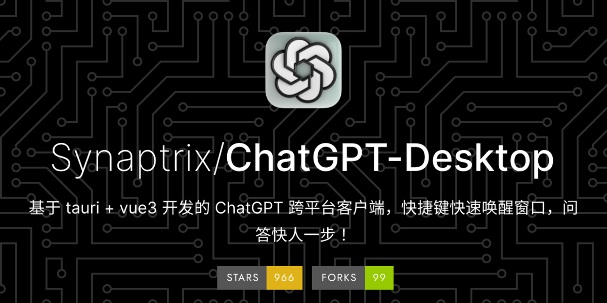 今回ご紹介する OSS は、Tauri(Rust で記述された軽量な GUI フレームワーク)と Vue3 で作成された ChatGPT デスクトップアプリ「ChatGPT Desktop」になります。