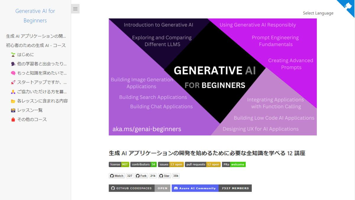 今回ご紹介する OSS は、Microsoft 社が生成 AI 初心者向けに無料で公開している講座サイト「Generative AI for Beginners」になります。