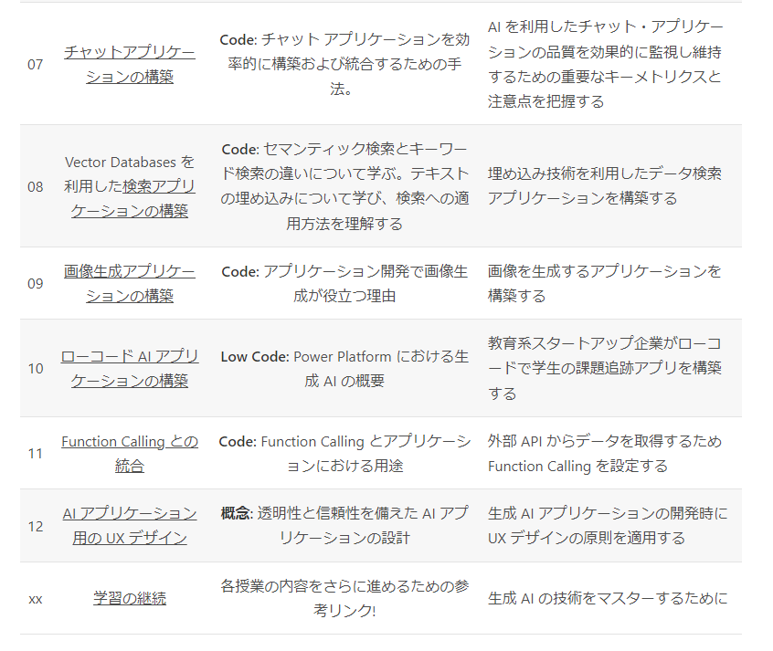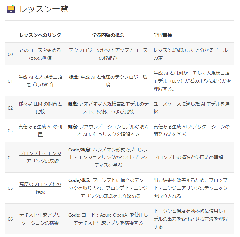 「Generative AI for Beginners」の講座は Microsoft 社が公開しているということからとても信頼感があるため、勉強も進みやすいのではないでしょうか?